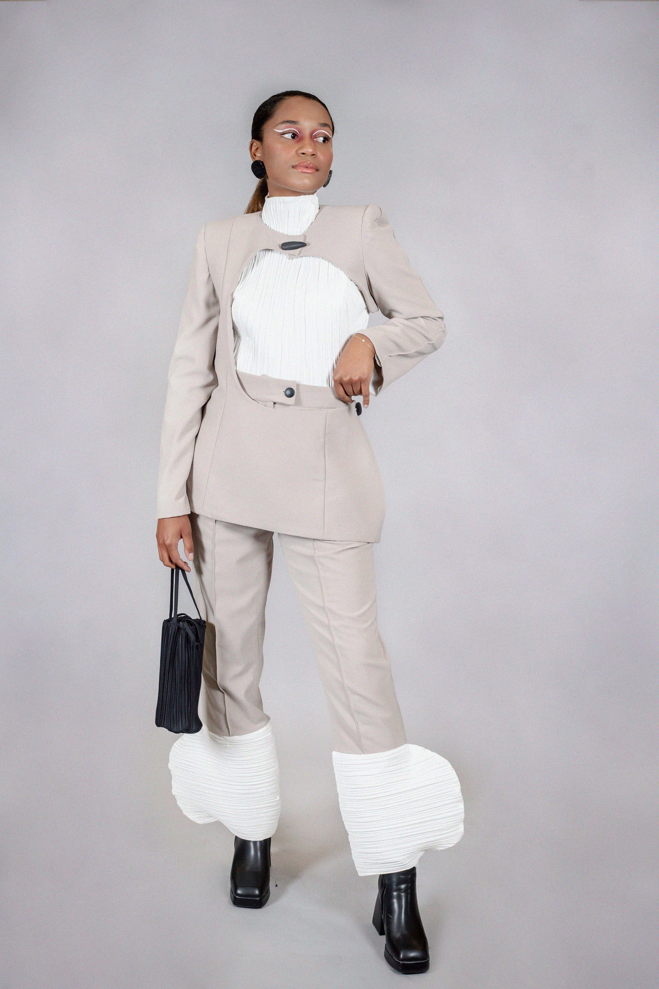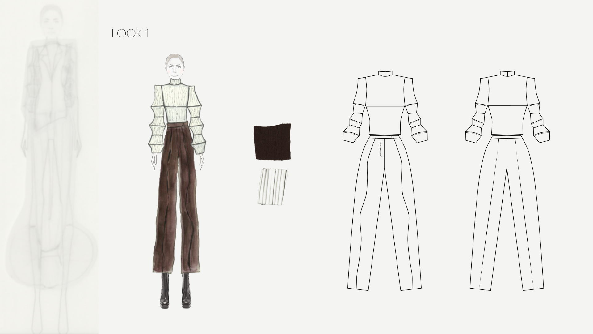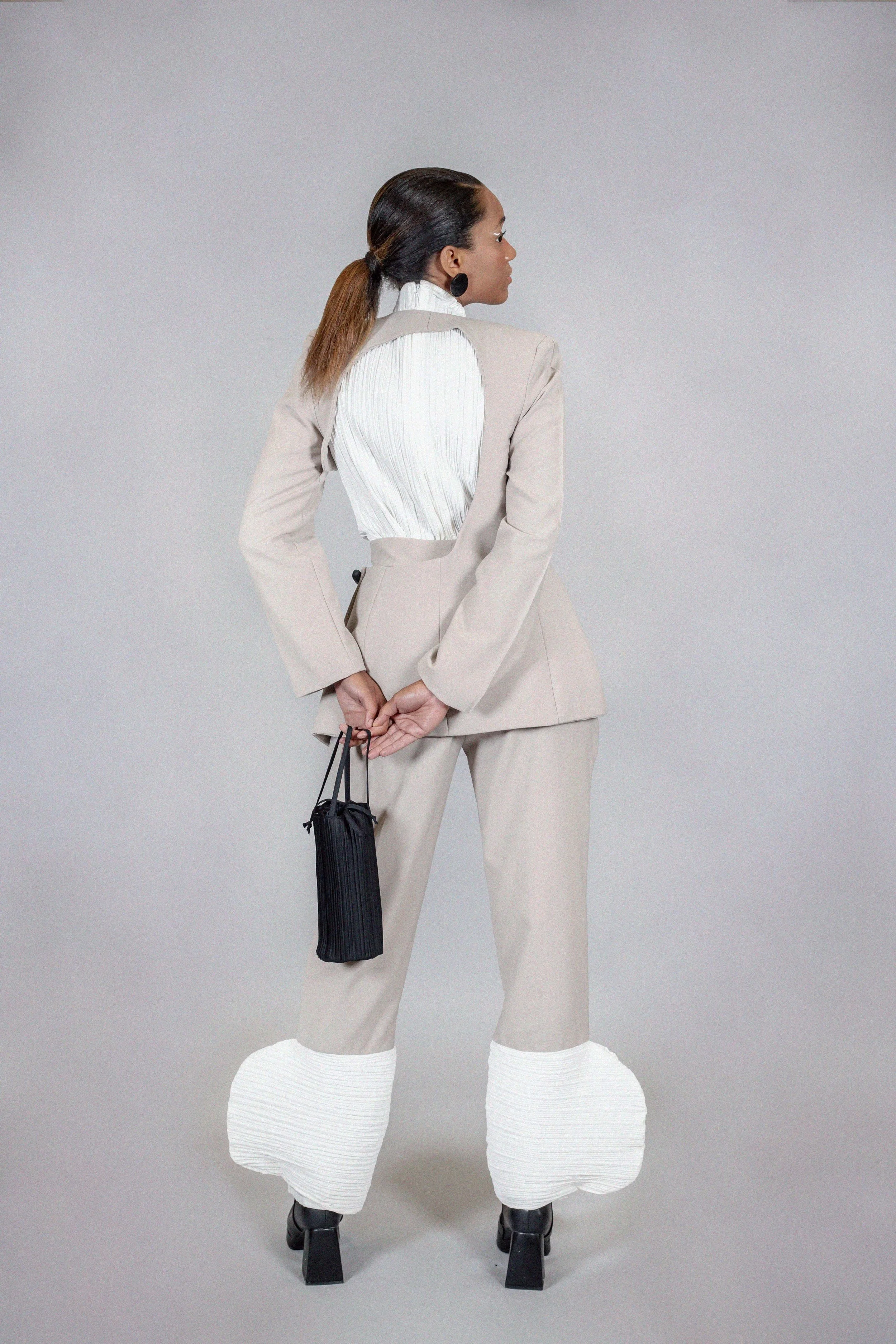 My collection, Saudade (melancholy in Portuguese), is also inspired by designers and artists I admire such as Cristobal Balenciaga, Issey Miyake, Isamu Noguchi, and Ruth Asawa. I honor their work and thank them for their brutal inspiration.”